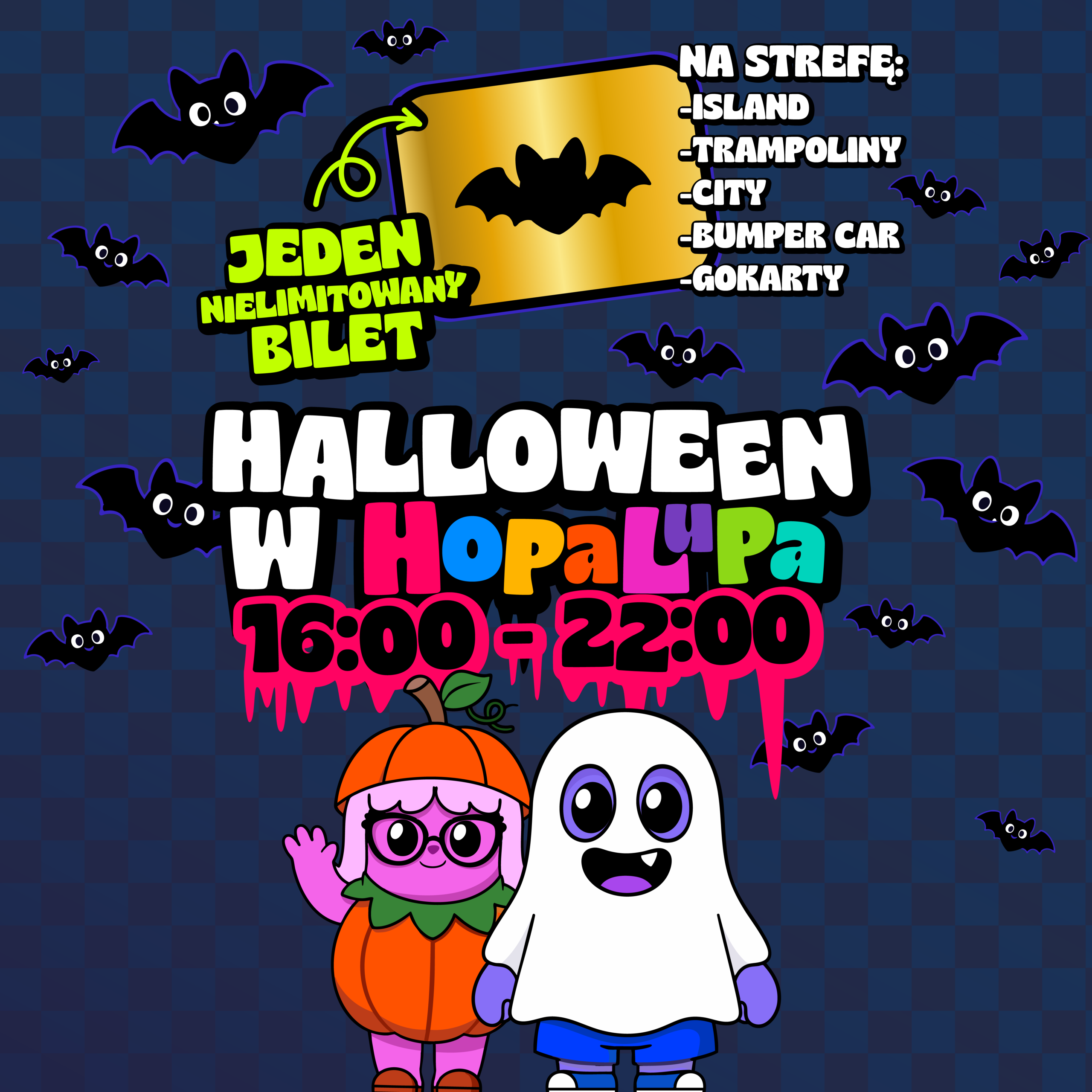 Hopa Lupa Politechniki 1, Łódź, Łódzkie, PolandJuż 31 października (piątek) od 16:00 do 22:00 – jedna noc pełna zabawy, konkursów i szalonych przebrań!Jeden nielimitowany bilet (79 zł) na wszystkie strefy: trampoliny, gokarty, city, bumper car i island!Nie przegap – liczba miejsc ograniczona!Bilety dostępne online i w kasach Hopa Lupa. Szczegóły w regulaminie dostępnym tutaj!